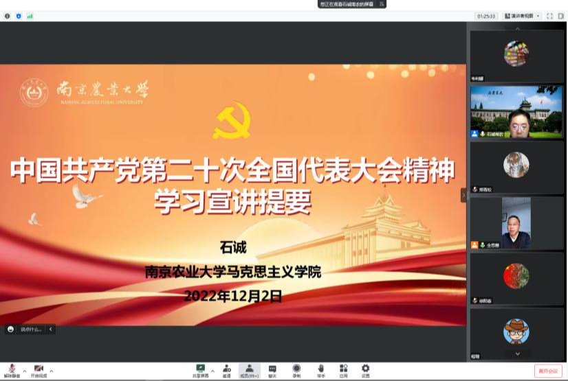 石诚副教授从党的二十大主题、主要成果,过去5年的工作和新时代10年的伟大变革,马克思主义中国化时代化,中国式现代化,全面建设社会主义现代化国家的目标任务,坚持党的全面领导和全面从严治党,应对风险挑战,教育、科技、人才“三位一体”等八个方面,对党的二十大精神特别是从“教育、科技、人才‘三位一体’”方面结合校史、院史资料和自己的研究成果及心得体会做了深刻的阐述和详细的解读。