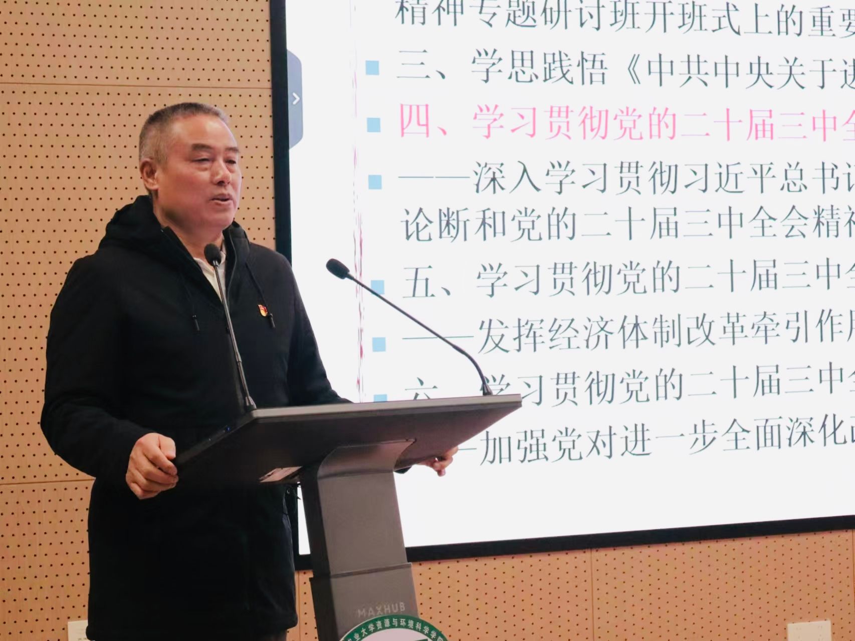 吴国清教授以《学习好贯彻好党的二十届三中全会精神》为主题,全面解读了全会的重大意义和深远影响。他强调,党的二十届三中全会是在全面建设社会主义现代化国家新征程上召开的一次重要会议,对于推动中国式现代化具有里程碑意义。他详细阐述了习近平总书记在全会上的重要讲话精神,并对《中共中央关于进一步全面深化改革、推进中国式现代化的决定》进行了深入解读。他指出,全会提出的深化改革重大举措,为新时代的中国发展指明了方向,也为资源与环境科学领域的研究和实践提供了新的机遇和挑战。