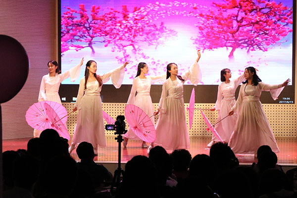 资环132的舞蹈《繁花•相送》在片片桃林中铺开,桃之夭夭,灼灼其华,她们手持一把油纸伞从画面里款款走出,起承转合,婀娜多姿。