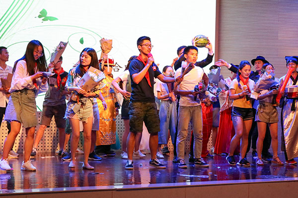 环科132酷炫的开场视频和生态131 别出心裁的光影表演从开学报道,课堂日常,球场英姿,图书馆的废寝忘食,场景来回切换,将大家的思绪带回那些相遇相知的日子。令人惊悚的妆容,让观众原本以为生态131的男生们将会带来一个丧尸主题的表演,结果画风突变,他们跳起了《小公主》,这猝不及防的反差,引起观众阵阵爆笑。