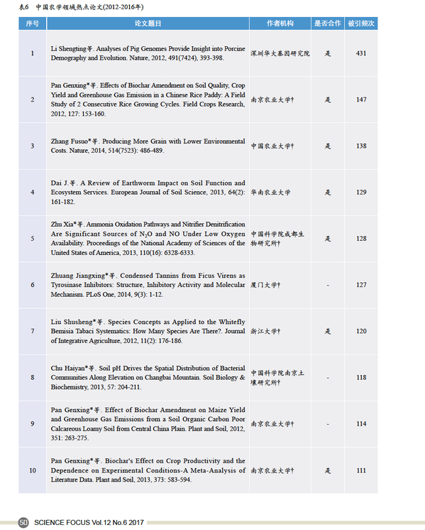近日,由中国科禁漫天堂文献情报中心科学计量团队发布的中国热点论文榜中,我校潘根兴教授团队3篇SCI学术论文入选中国农学领域十大热点论文。“热点论文”,顾名思义,即为众人所关注的论文,这种关注度在科学计量学领域可以用论文被引用的次数来量化和测度。该榜单以2012-2016年中国科学家的SCI论文为数据基础,分领域统计了自发表以来被引频次最高的论文,以展现颇具显示度的中国科技成果。本期发布的热点论文榜涉及数学、物理学、化学、生物学、医学、农学、地学、环境科学和工程技术9个领域。