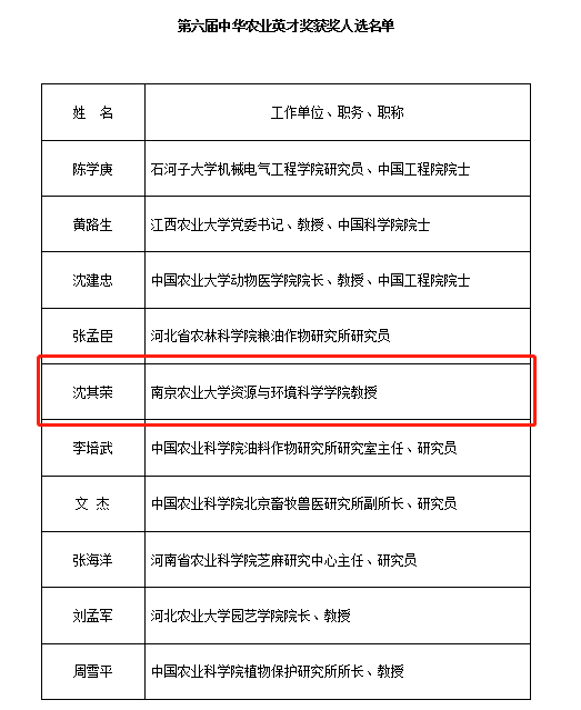 沈其荣教授长期从事有机肥、生物肥、土壤微生物等领域研究,建立了堆肥pH控制技术,研发出条垛式高效堆肥工艺及系列有机(类)肥料产品,对我国有机肥和生物肥产业的快速发展做出了重大贡献。沈其荣教授曾获国家教学名师、全国优秀科技工作者、全国师德先进个人、全国创新争先奖等称号;获国家技术发明二等奖、国家科技进步二等奖各1项,中国专利金奖1项,中国专利优秀奖2项;以第一或通讯作者发表SCI论文150多篇,H指数48,连续四年入选Elsevier中国高被引学者榜单;授权中国发明专利73件、国际专利6件。