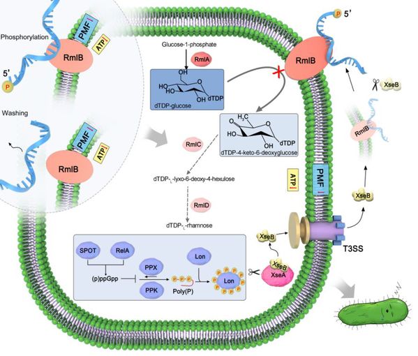 研究人员通过鉴定出PAO1细胞表面特异性的持留态调控组件poly(dC)/RmlB复合体。发现PAO1必要时会将VII型核酸外切酶小亚基XseB分泌至胞外,原位剪切poly(dC)/RmlB复合体中的poly(dC),使其转变为poly(dC)的磷酸化形式P-poly(dC)。也就是说,研究人员准确定位到PAO1发送“睡眠指令”的“开关”,可以精确切断这个“开关”,从而影响持留菌的形成,轻而易举地击破细菌的这个“生存法宝”。