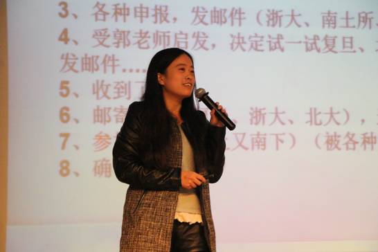 第二位发言的是环境工程邢佳佳同学,她被保研至浙江大学。她主要跟大家述说她的保研历程,强调了兴趣和毅力对实现理想的重要性,希望大家能对自己的喜好持之以恒并取得成就。