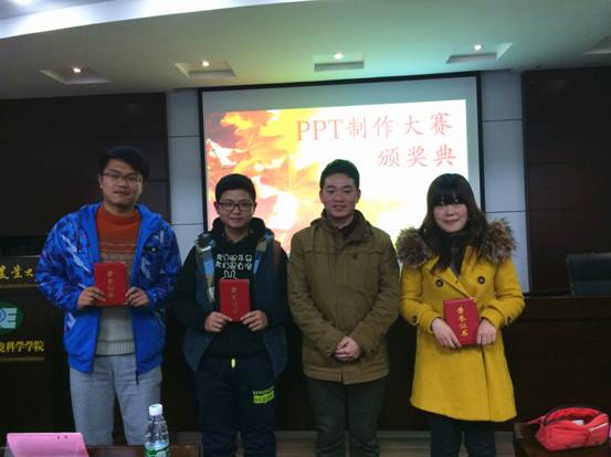 2014年PPT设计大赛决赛。参加大赛的评委有院团委副书记李长钦,院兼职辅导员汪羽蓝、朱瑜超和学生会副主席刘畅。大赛由科创主任王祯祎主持。