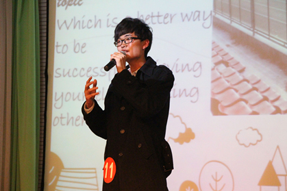 比赛分为主题演讲,即兴演讲,个人才艺展示和评委提问四个环节。在主题演讲中,选手们或激情澎湃,或娓娓道来,针对大学教育,网络影响,成功方法等热点问题发表自己的观点,特别是结合自己学习、生活、工作中的实际问题谈论切身体会,引发了评委老师与观众的广泛共鸣。即兴演讲和评委提问环节考察的是选手们的临场应变能力,选手随机选题和评委随机进行提问,选手们现场一一作答,其中评委幽默的问题和选手机智的作答不时博得观众们的阵阵掌声。在个人才艺的环节,选手们使尽浑身解数,或魔术或唱歌,展示当代大学生多姿风采。最终,来自资环131的11号选手孙光稷凭其流利的演讲,幽默的回答和一首浪漫的英文歌赢得了本次比赛的冠军。