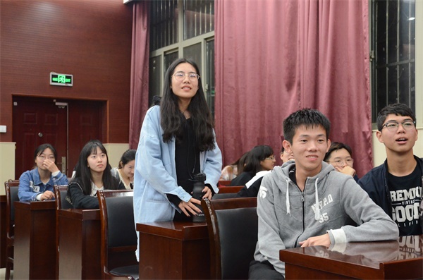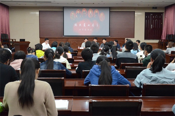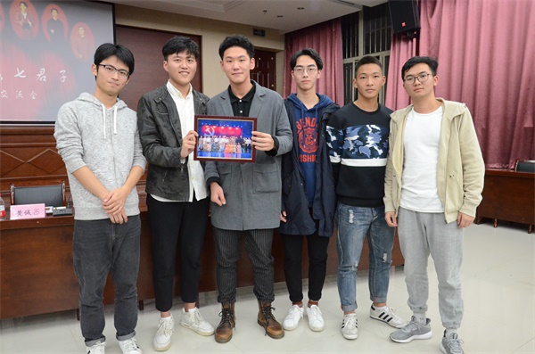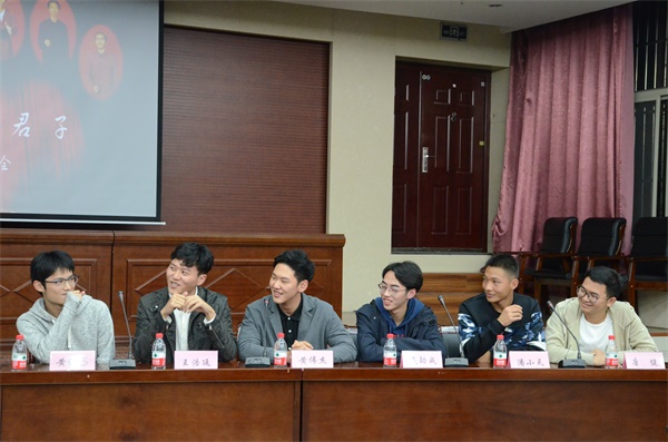 1019日晚7时,《北大荒七君子》交流会在资环楼报告厅举行。本次交流会邀请到了其中六位演员:黄诚忞(饰演吴枫)、王浩廷(饰演吕世恒和高科长)、黄伟杰(饰演程全生)、戴劲成(饰演官英堤)、潘小天(饰演刘排长)、唐健(饰演刘书记),交流会由石伟希主持。