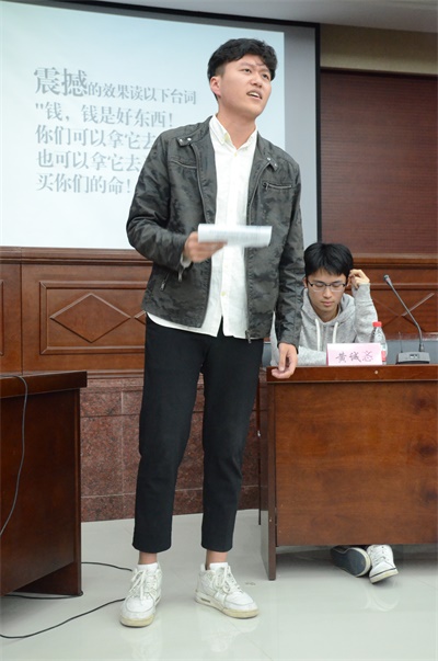 接着主持人采访了他几个问题:加入了这个团队,在表演方面有什么进步吗?一般校内的话剧只演出一次,像这样大型话剧需要排练很长时间并多次演出,这是一种怎样的体验呢?