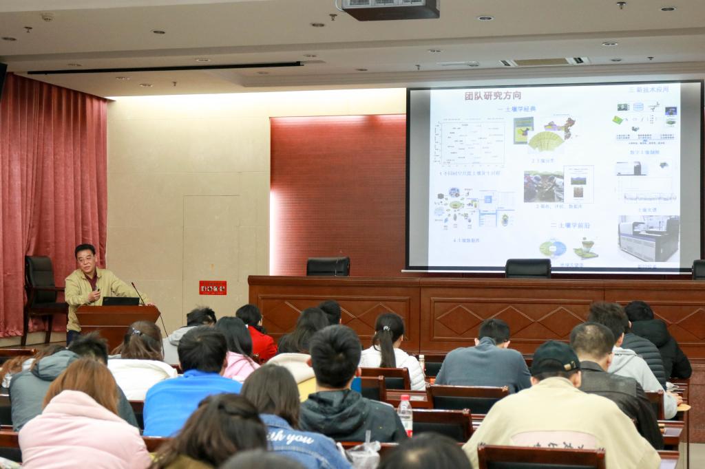 李德成研究员的报告主题是“年轻的校友们,来!和我们一起走天下!”他负责的领域是传统土壤地理学。首先他为同学们介绍了自己的团队,“掘天下土壤,览天下美景,尝天下美食,交天下朋友”是李研究员所在团队的特色。其次他为同学们介绍团队近年来的科研成果以及研究方向。李研究员用幽默的语言向大家介绍着土壤如同人类世界。李德成研究员及其所在团队踏遍了祖国的大好河山,用双脚测量着祖国的面积,一系列的美食与美景的图片深深吸引着在座的同学们。